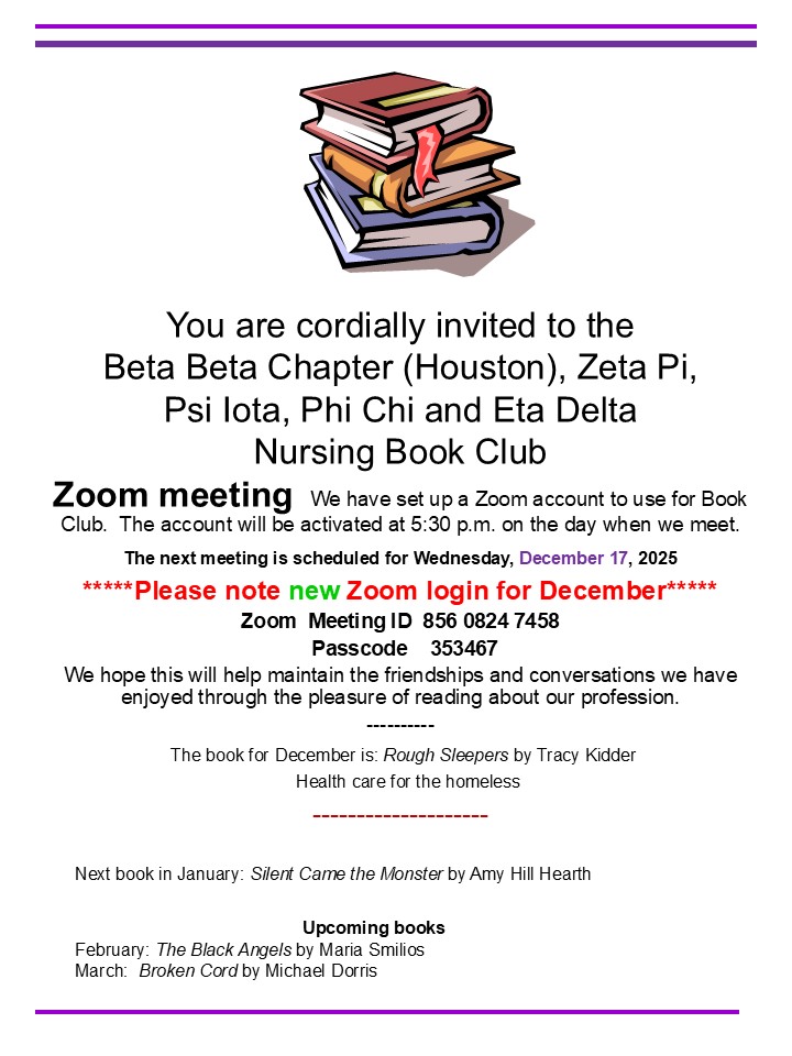 Please join us for our monthly Book Club with Beta Beta Houston.
